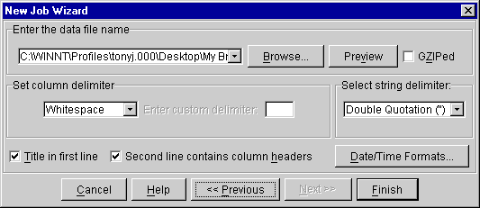 On top is a panel where you can select the file to open. The 'Browse...' button allows you to select a file from a file dialog, the 'Preview' button will show you the first 100 lines or so of the file, and the GZiped check box allows you to set whether the file is in GZip format.